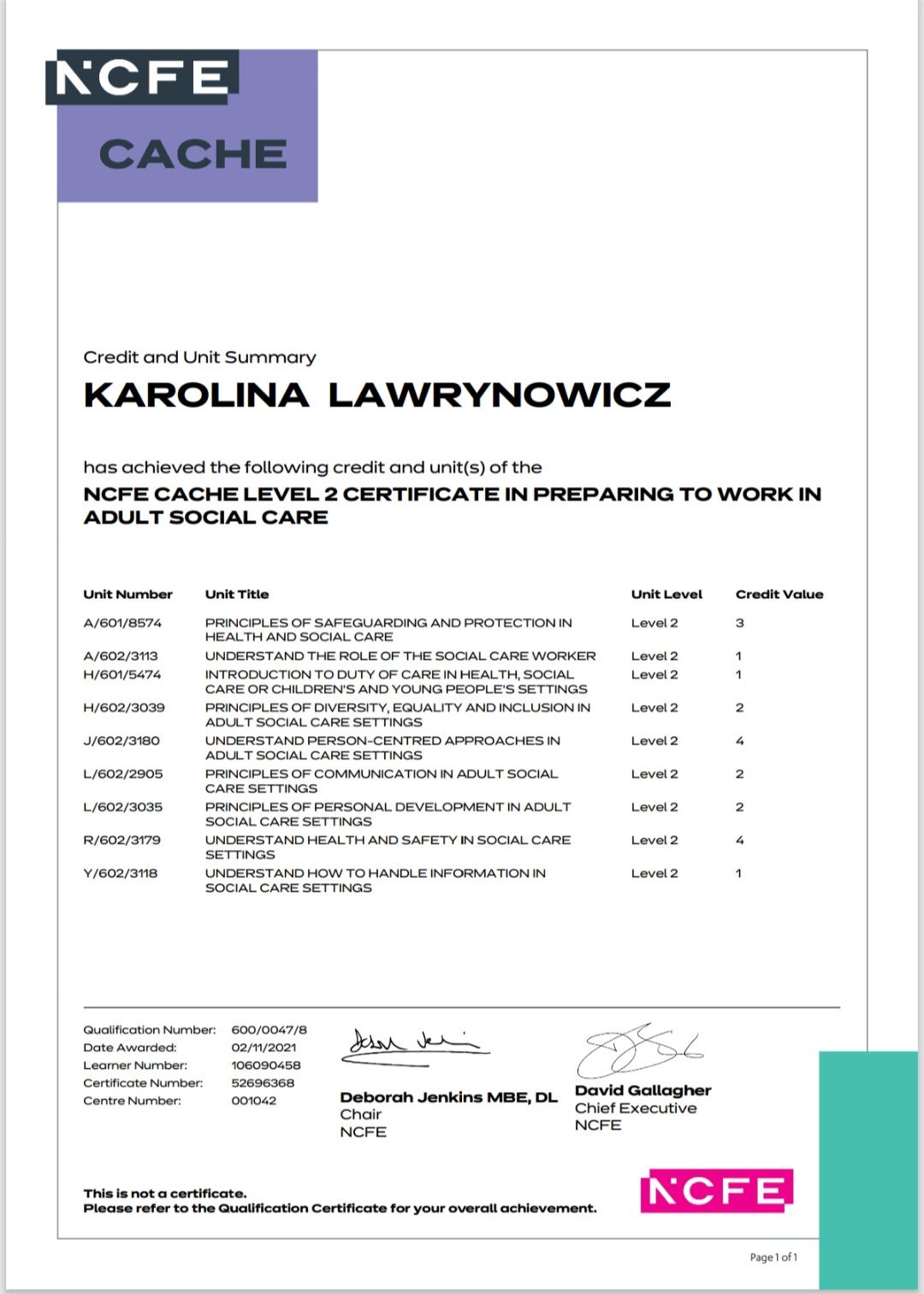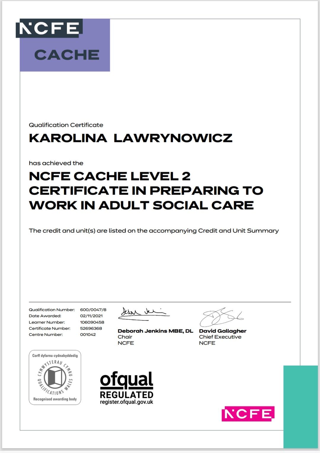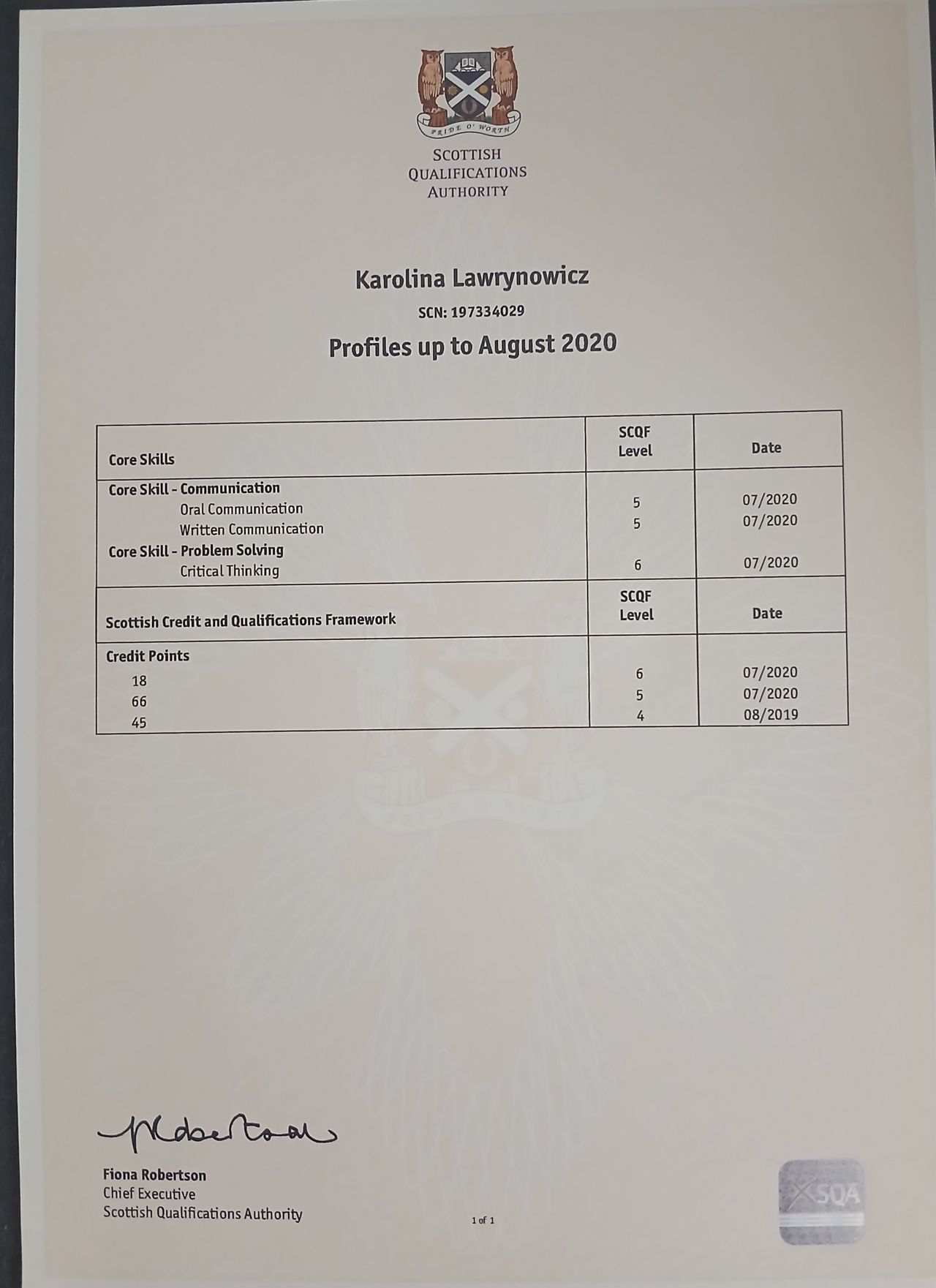 Część edukacji zdobyłam w Szkocji (Glasgow), gdzie ukończyłam 2-letni collage językowy z akredytacja SQA oraz roczny kurs przygotowujący do pracy w opiece społecznej dla dorosłych- NCFE CACHE Level 2 Preparing to Work in Adult Social Care.
