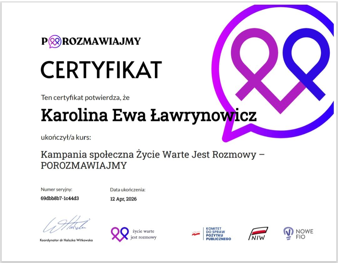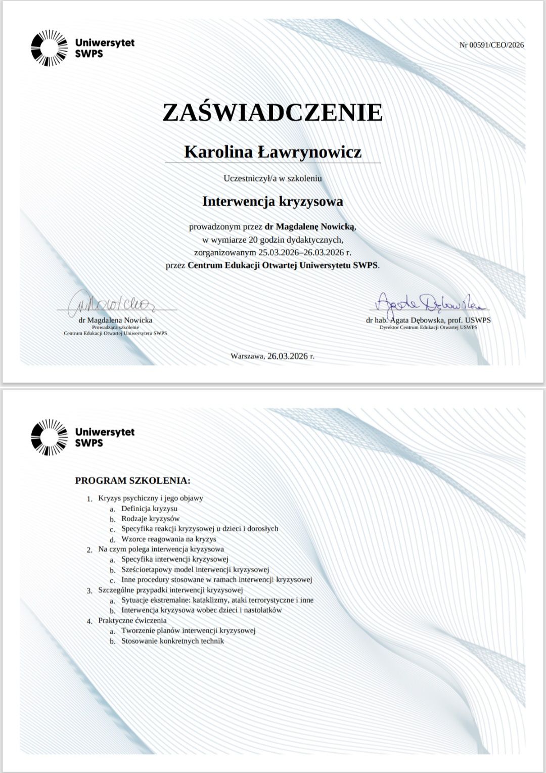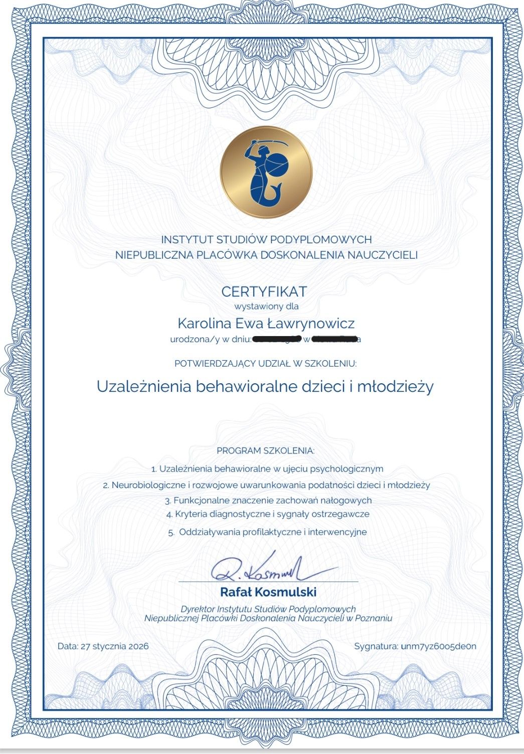 Jestem psychologiem, politologiem i socjologiem .Ukończyłam jednolite studia magisterskie z psychologii o specjalności psychoprofilaktyka i pomoc psychologiczna oraz studia magisterskie II stopnia z psychologii w zarządzaniu . Jestem także absolwentką politologii i socjologii, co pozwala mi szeroko analizować funkcjonowanie człowieka w kontekście społecznym, zawodowym i kulturowym.