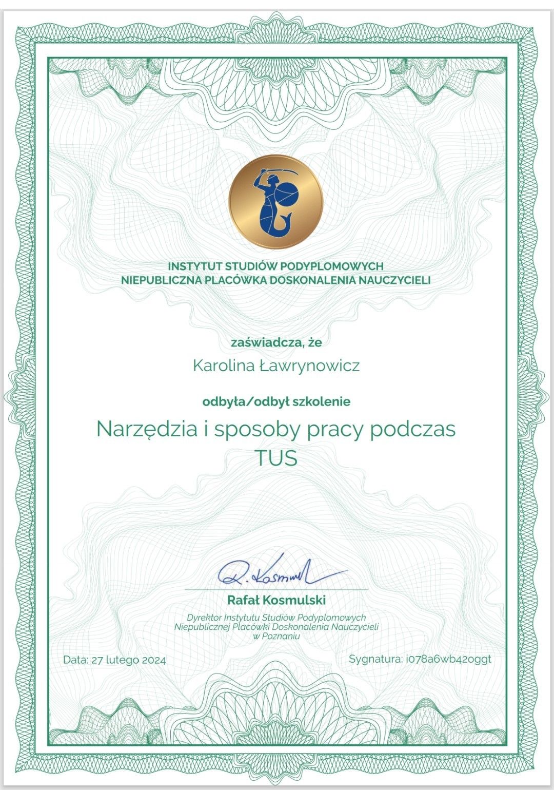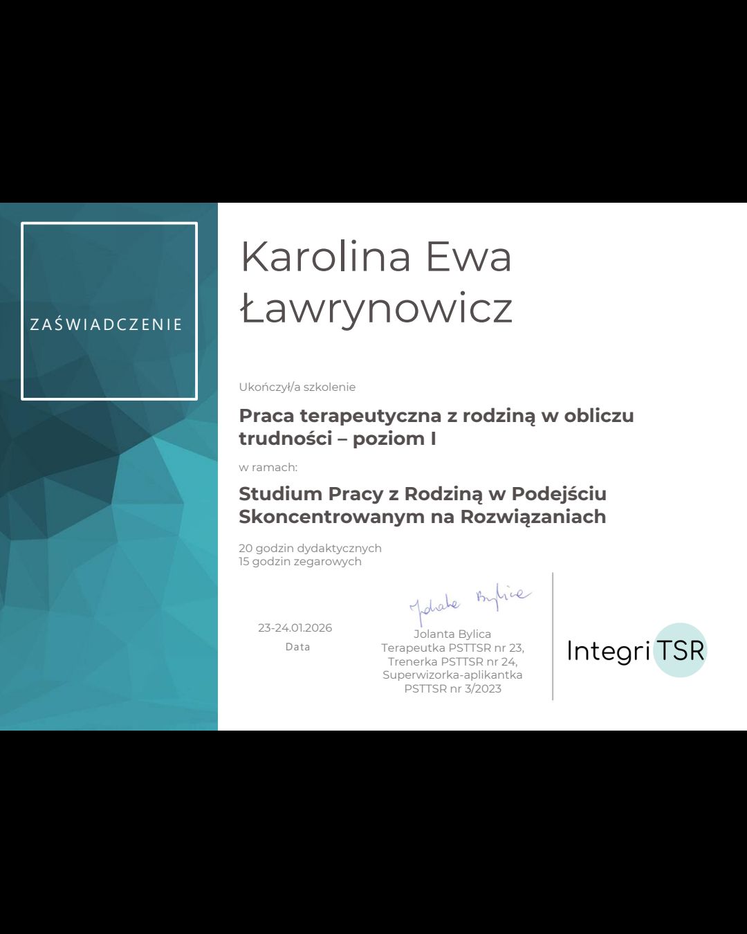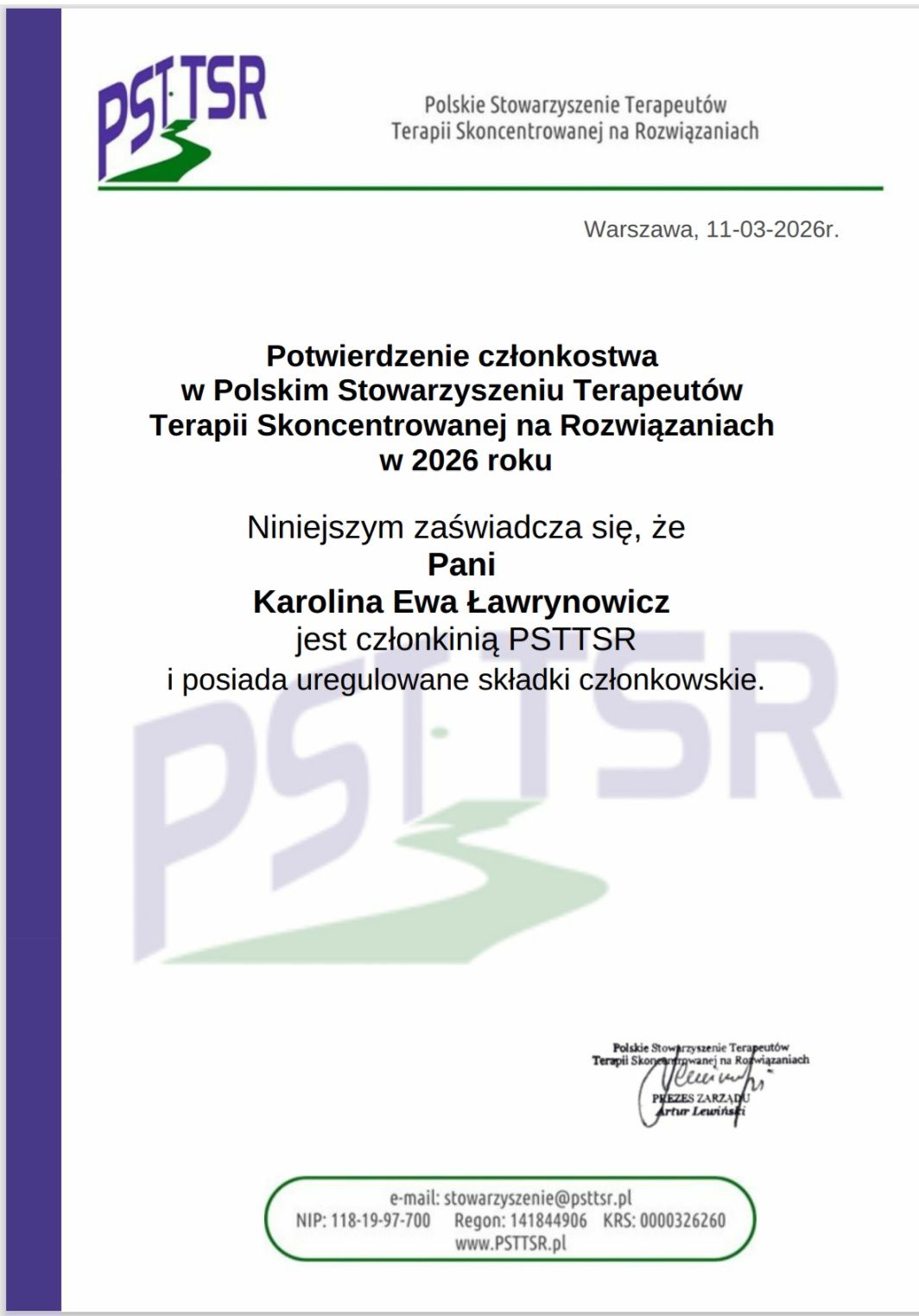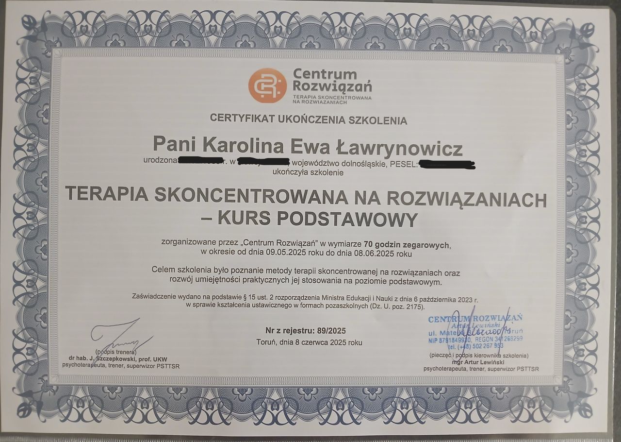 Pracuję w nurcie Terapii Skoncentrowanej na Rozwiązaniach (ukończyłam I stopień obecnie realizuje II) w Centrum Rozwiązań w Toruniu, akredytowanym przez Polskie Stowarzyszenie Terapeutów TSR. Dodatkowo ukończyłam Studium pracy z rodziną w akredytowanym ośrodku Integri TSR oraz kurs z interwencji kryzysowej (SWPS). Jestem członkiem Polskiego Stowarzyszenia Terapeutów Terapii Skoncentrowanej na Rozwiązaniach.